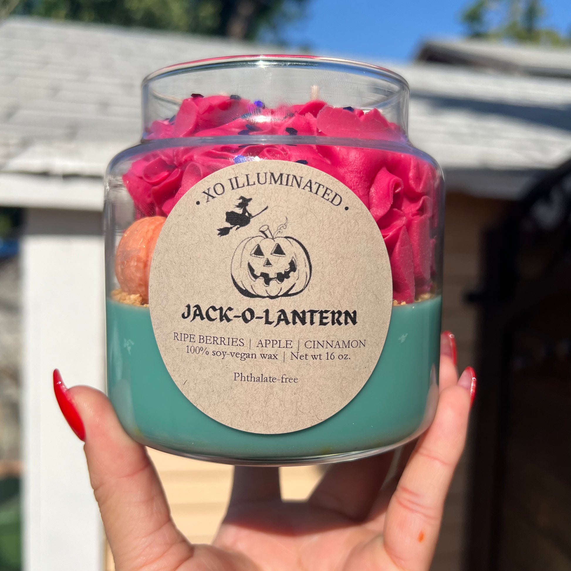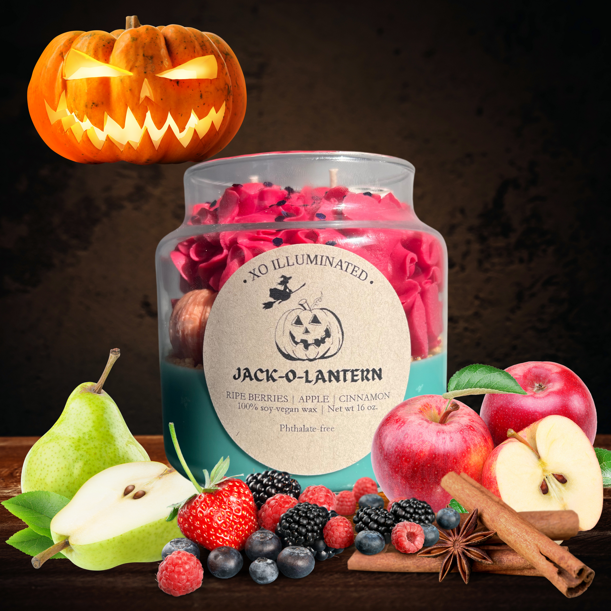 Get your hands on this Spooktacular 16 oz Halloween Town inspired Jack-O-Lantern candle. This candle smells like the classic BBW scent Harvest Gathering. It is crafted with notes of ripe berries, juicy peach, crisp apple, cinnamon, and clove. The scent is so delicious and will have your house guests wondering where you got that amazing smelling candle! This candle also features 2 cotton wicks and an assortment of pumpkin and ghost molds.