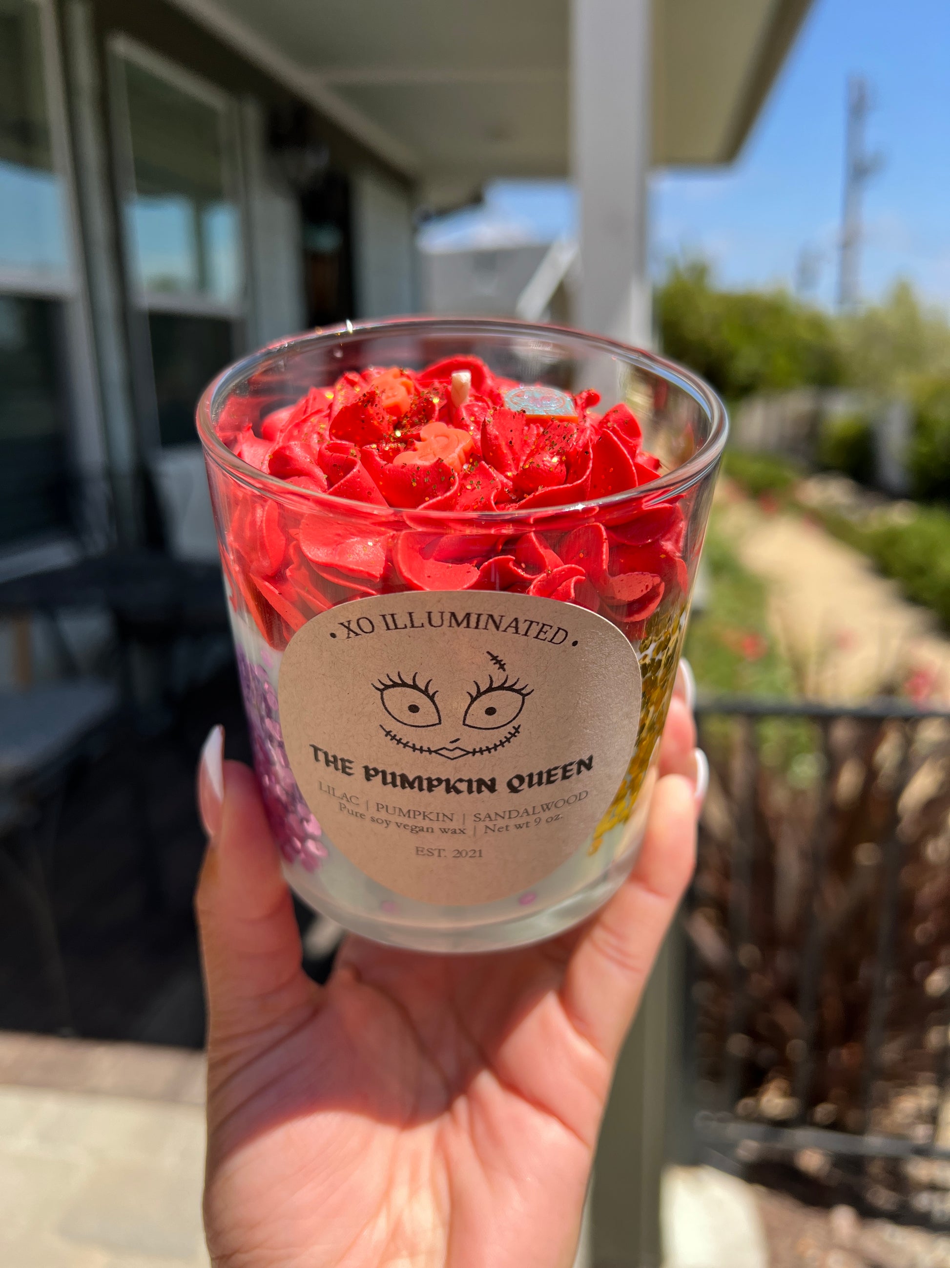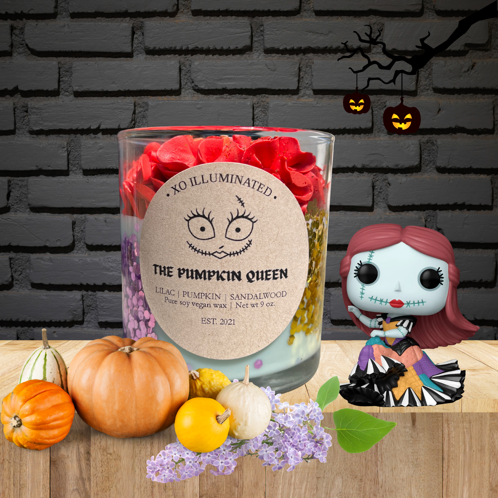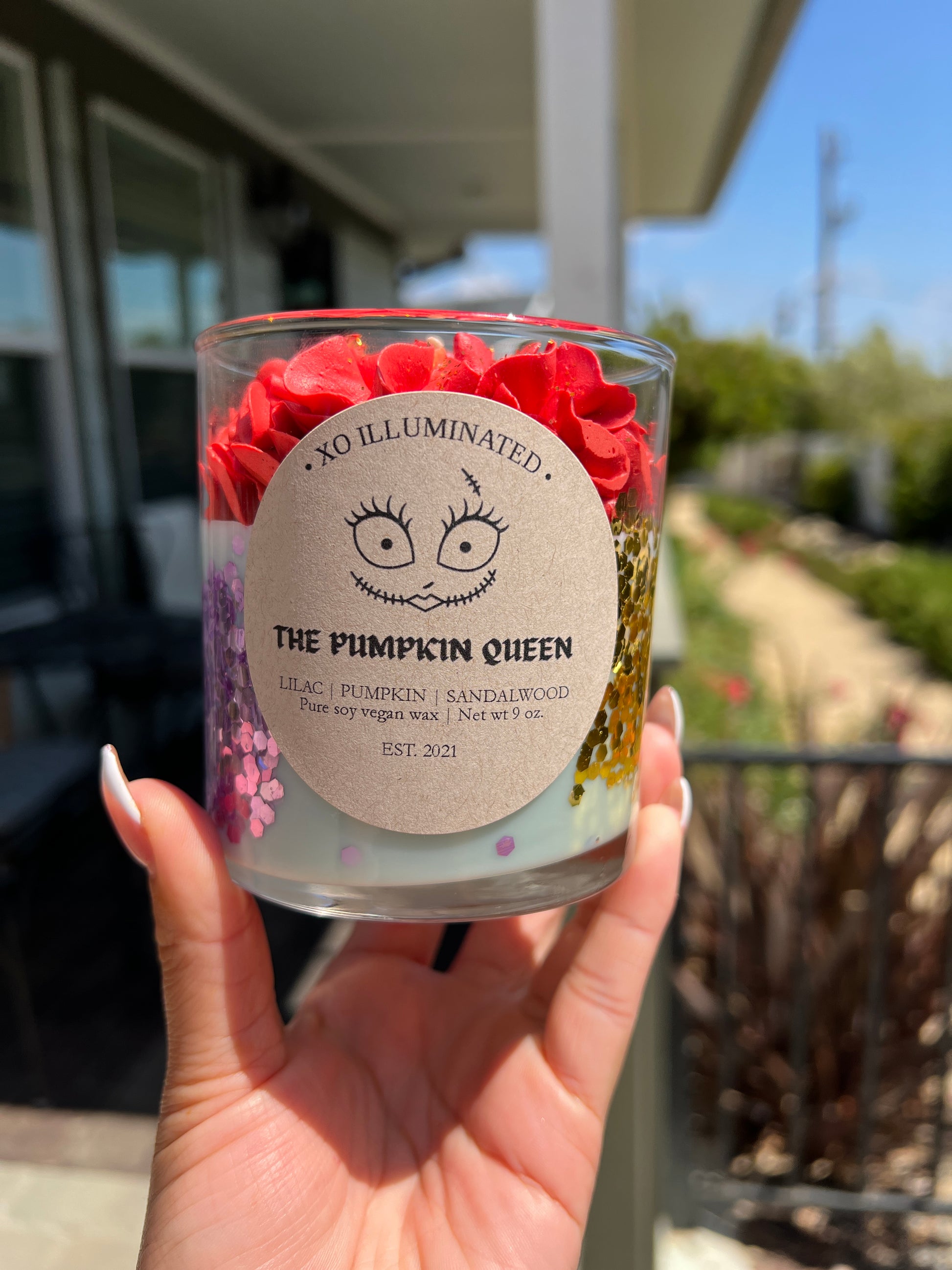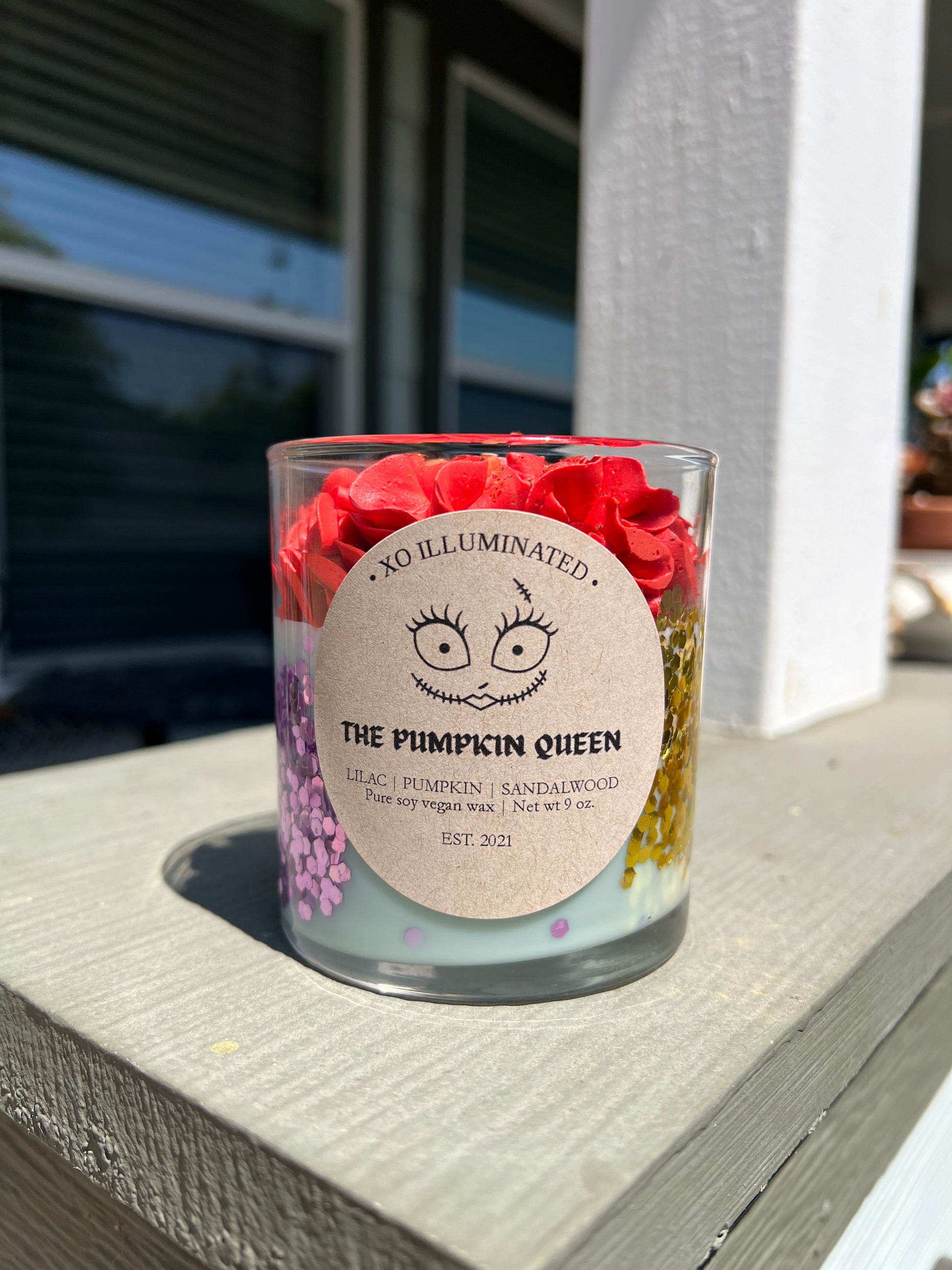 Inspired by Disney's Nightmare Before Christmas' Sally, The Pumpkin Queen. Crafted with notes of pumpkin, cedarwood, sandalwood, violet, iris, lilac, and buttercream. This candle will have your home smelling like Fall in no time!