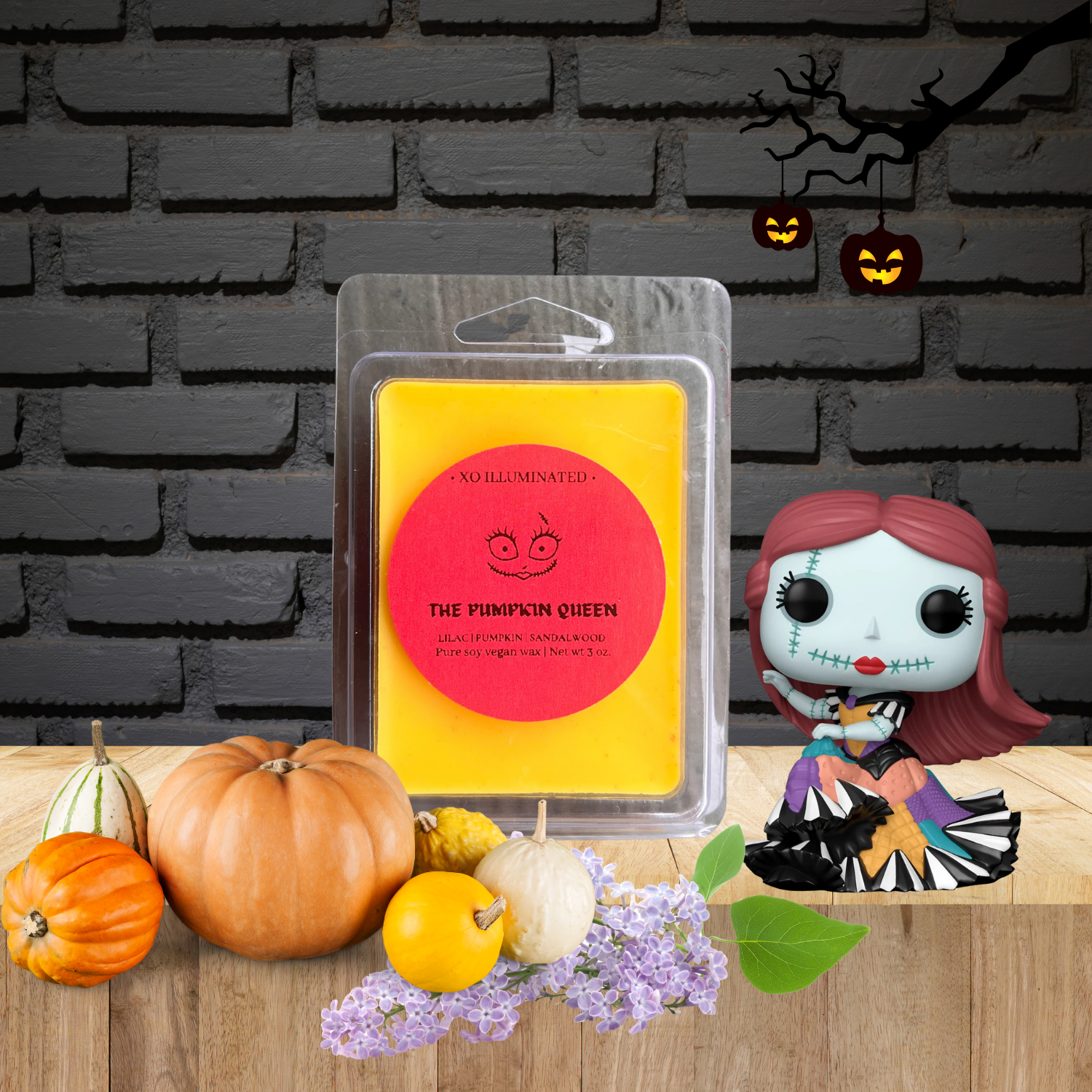 Inspired by Disney's Nightmare Before Christmas' Sally, The Pumpkin Queen. Crafted with notes of pumpkin, cedarwood, sandalwood, violet, iris, lilac, and buttercream. These melts will have your home smelling like Fall in no time! Melts are also crafted wit mica powder.