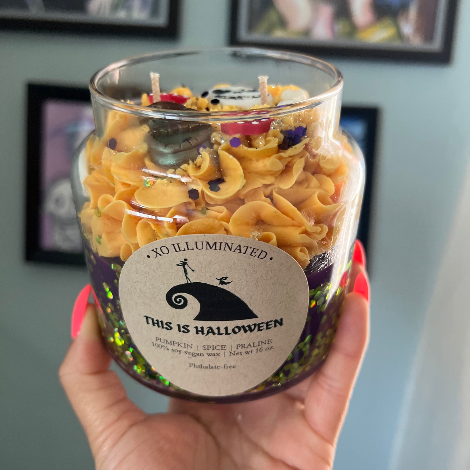 If you loved our Pumpkin King candle you will love this double wick 16 oz candle inspired by Disney's Nightmare Before Christmas, This is Halloween. Crafted with notes of pumpkin, molasses, praline, caramel, brown sugar, and nutmeg this candle will have your home smelling like Fall in no time! IT SMELLS SIMILAR TO OUR PUMPKIN KING CANDLE WITH A KICK OF SWEETNESS! Each candle includes an assortment of Halloween inspired wax molds that melt when lit.