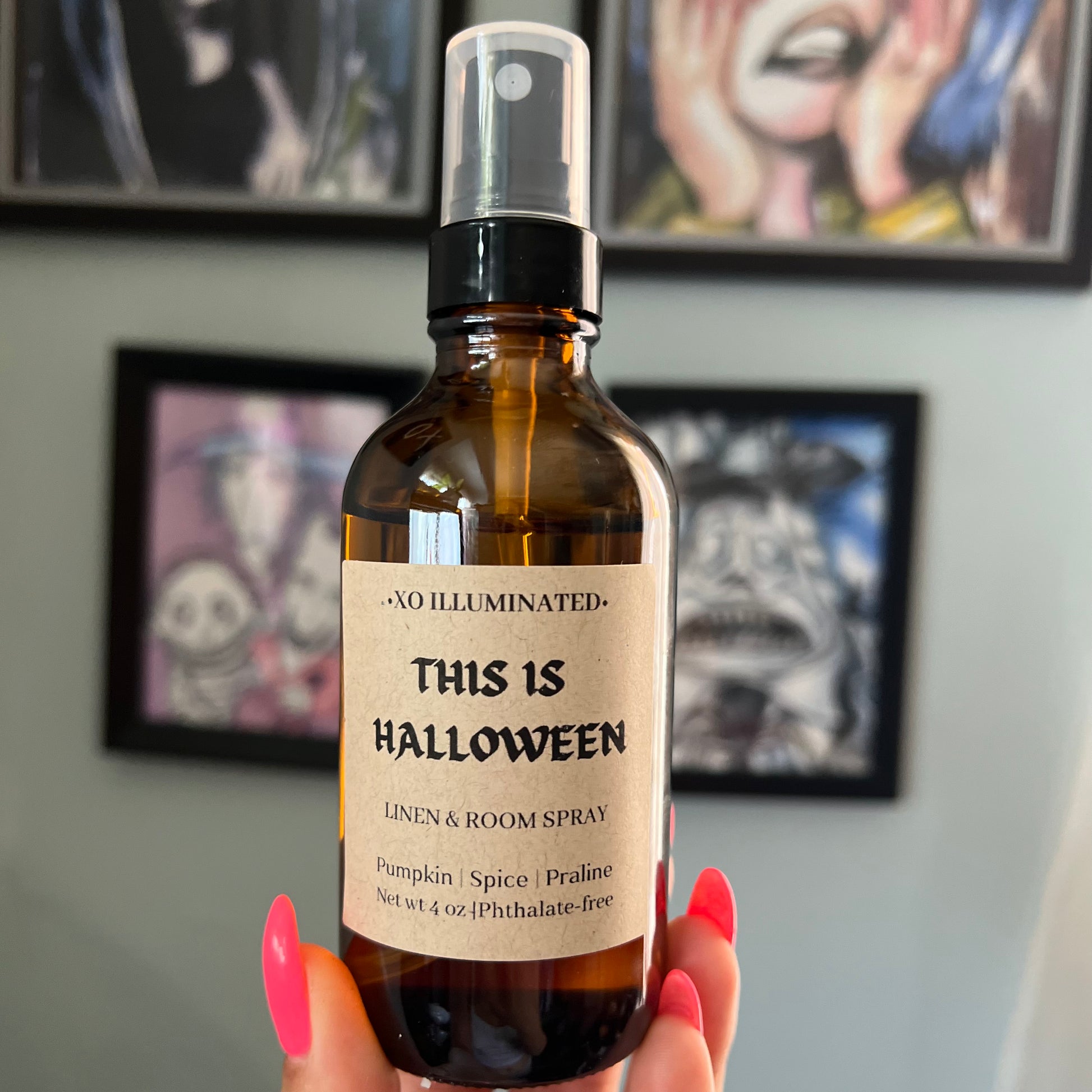 If you loved our Pumpkin King candle you will love this room/linen spray inspired by Disney's Nightmare Before Christmas, This is Halloween. Crafted with notes of pumpkin, molasses, praline, caramel, brown sugar, and nutmeg this spray will have your home smelling like Fall in no time! IT SMELLS SIMILAR TO OUR PUMPKIN KING CANDLE WITH A KICK OF SWEETNESS!
