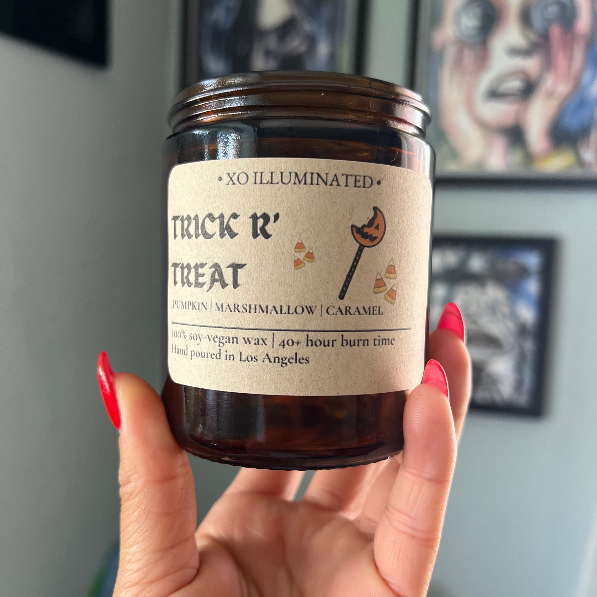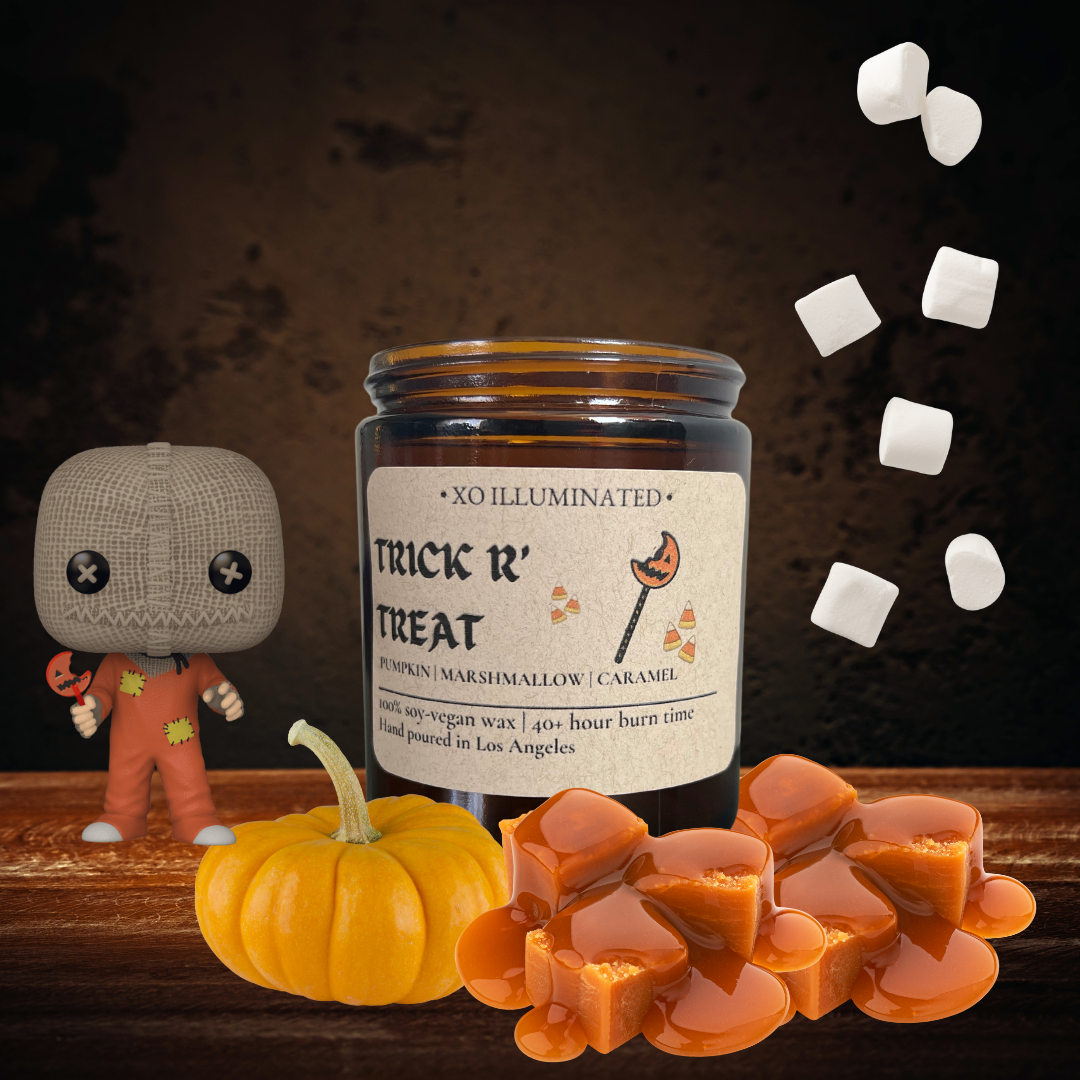 Trick R' Treat candle. This candle smells like Vanilla Pumpkin Marshmallow and is crafted with notes of pumpkin, creamy vanilla, whipped buttercream, gooey caramel drizzle, and cinnamon!